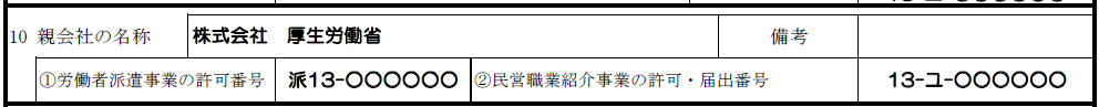 10は親会社がある場合はその情報を、親会社が職業紹介の許可を受けている場合はその許可番号を書きましょう。