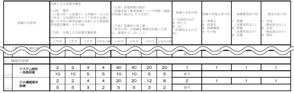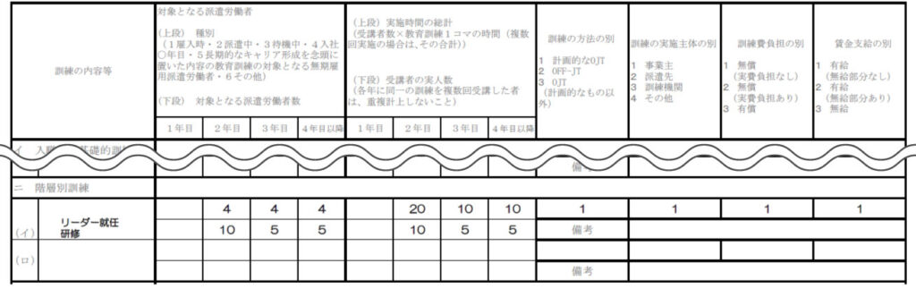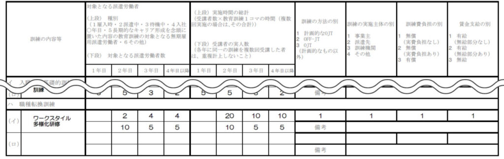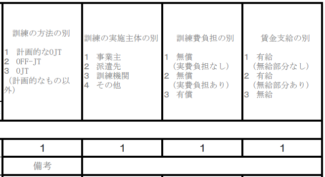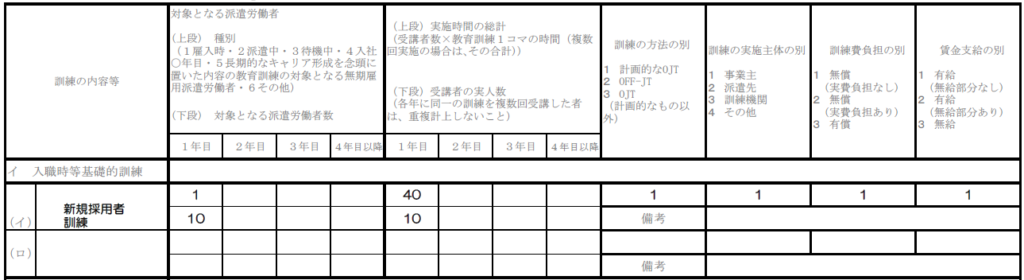 - 訓練費負担の別:派遣元による実施(必ず「1」)