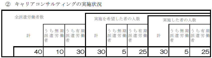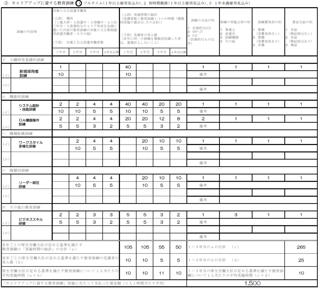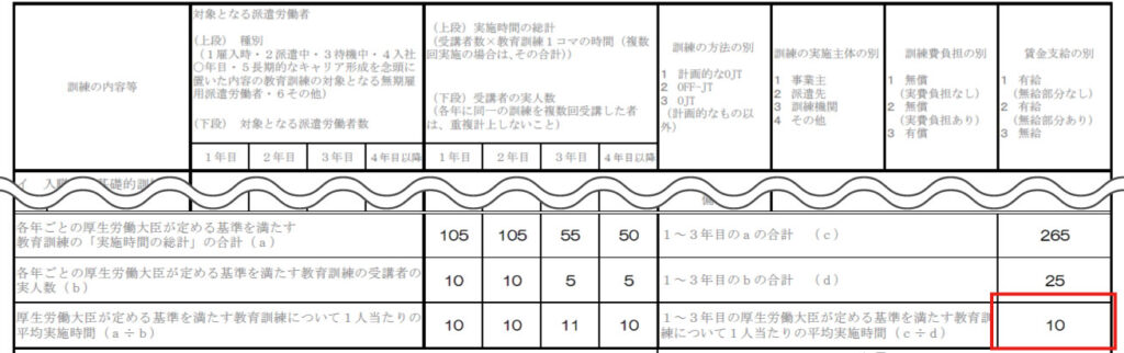 その結果「1~3年目の厚生労働大臣が定める基準を満たす教育訓練について1人当たりの平均実施時間」に入る数字が8以上でないと、派遣法違反になりますので注意しましょう。