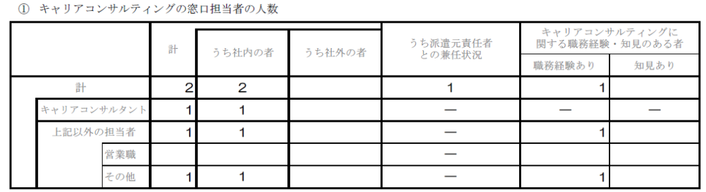 まず、キャリアコンサルティング担当者の人数を記入します。